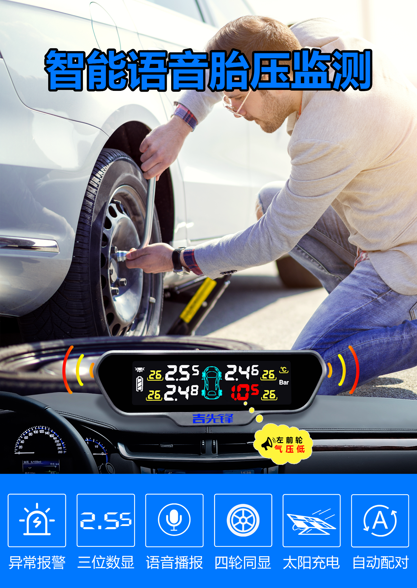 1.都能聽得懂的會說話的胎壓檢測 2.主動報告壓力監測正常的胎壓監測 3.報告左前、右前、左后、右后具體位置狀態的胎壓監測 4.耐高溫暴曬的大彩屏太陽能胎壓監測 5.高精度三位數字顯示的胎壓監測 6.四個輪胎壓力和溫度同時顯示的胎壓監測 7.可弱光充電的太陽能永不外接充電的胎壓監測 8.更換傳感器可自動學習配對的胎壓監測 9.車規級純銅氣嘴傳感器 10.可自行更換傳感器電池延長使用壽命的胎壓監測