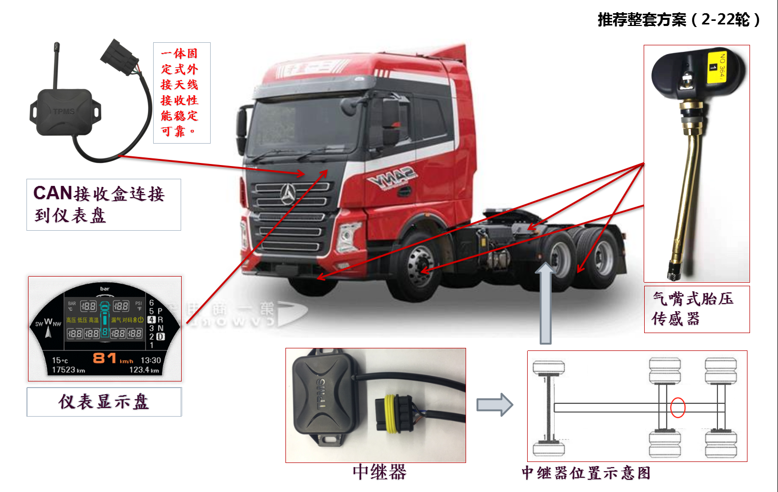 三一重卡車廠 無論駕車人員的如何調整前輪位置,都可以正確地測量左右位置,智能調整儀表上的對應輪胎壓力顯示位置及溫度。
